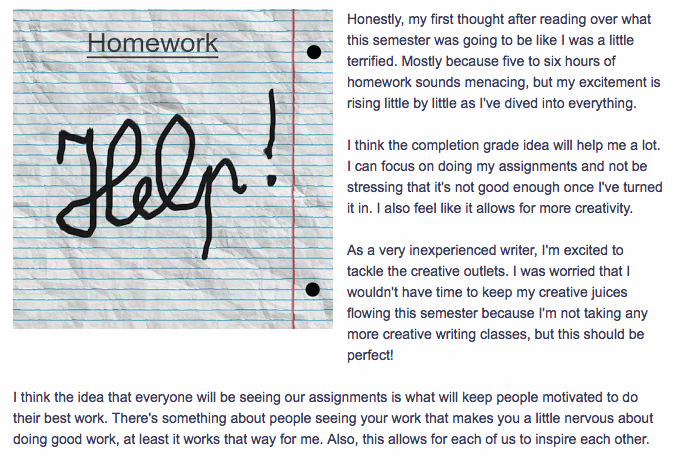 When I introduce this admittedly strange grading system to the students in their very first assignment for the semester, I include a link to those student comments. I can go on (and on and on) about the advantages of this system, but the most powerful words come from the students themselves! Here's how I introduce all this on the first day of class: